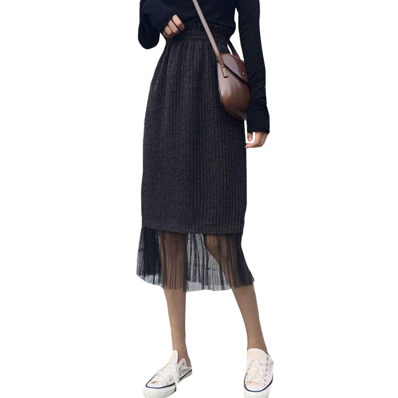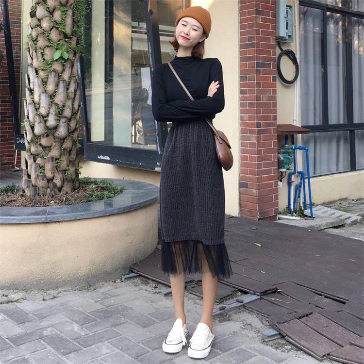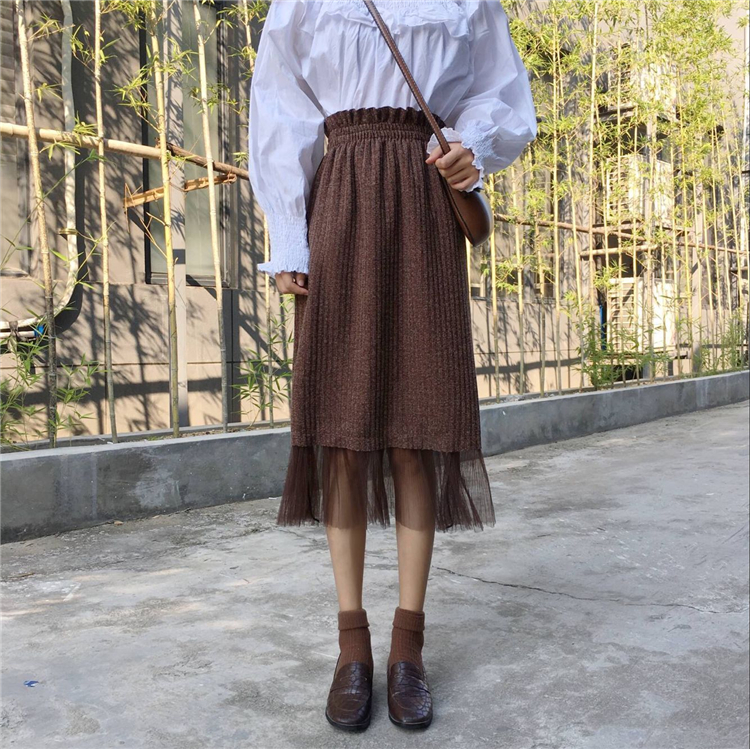 秋季韓版花苞高腰過膝網紗拼接半身裙中長款A字裙長裙學生裙子女