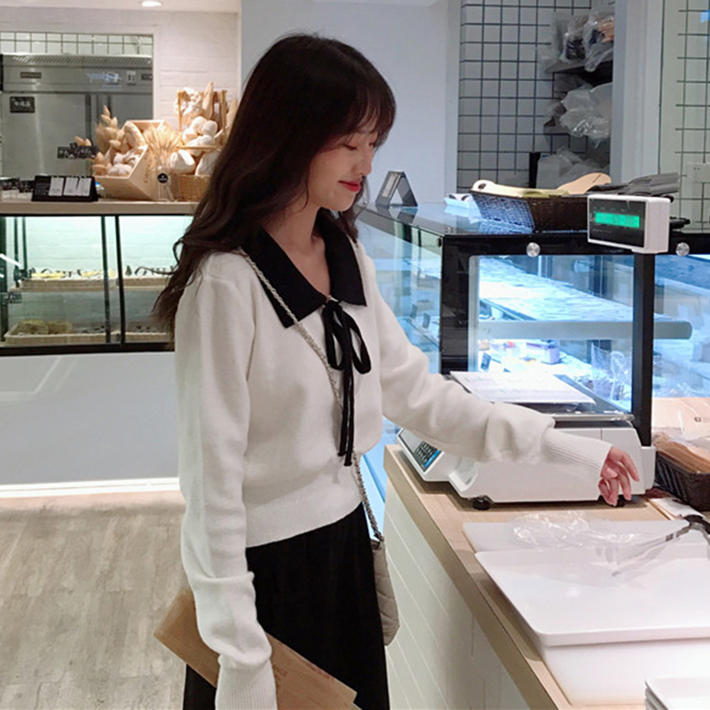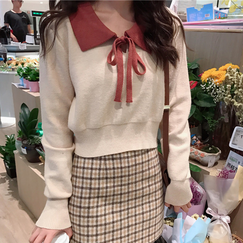 / 甜美學院風短款針織衫秋裝2018新款少女時尚拼色系帶長袖打底上衣