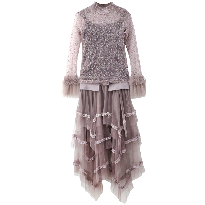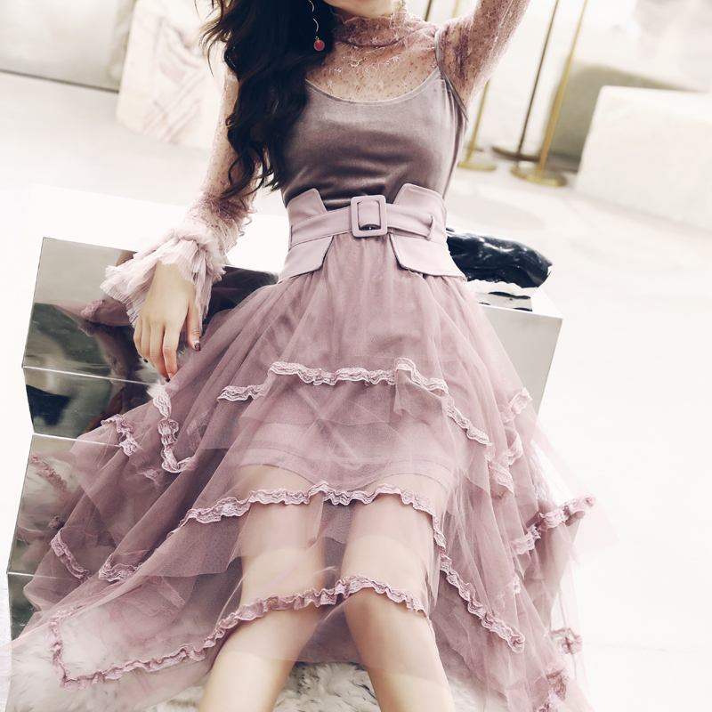 套裝女2018新款秋裝韓版時尚氣質蕾絲淺紫色吊帶裙子腰封三件套