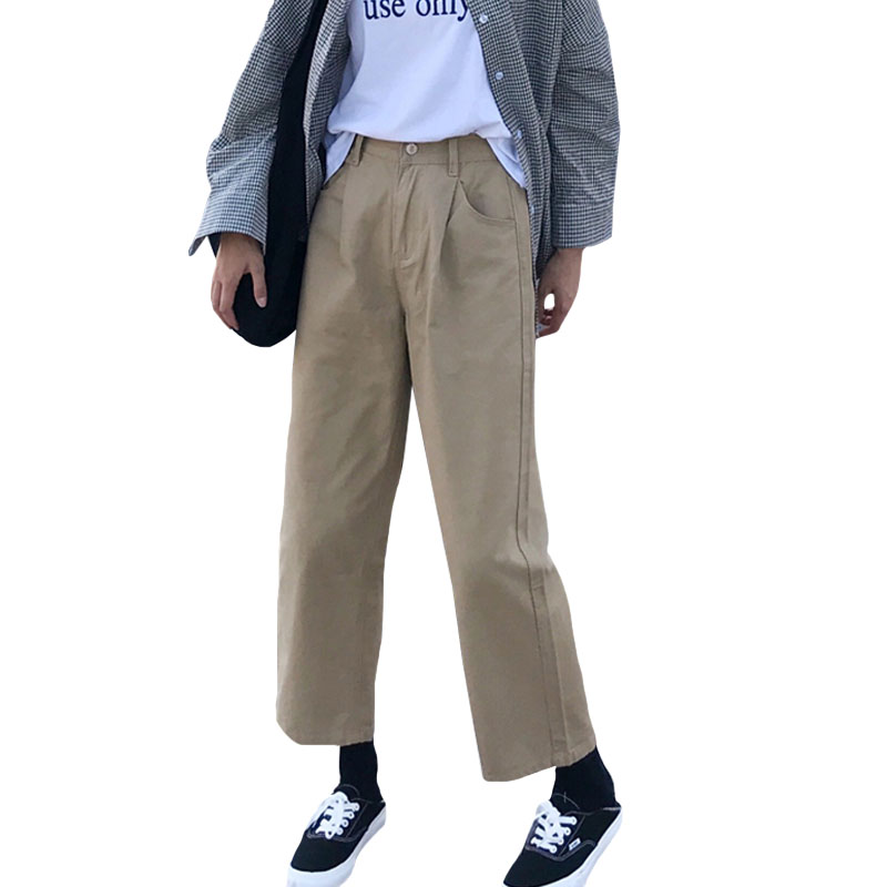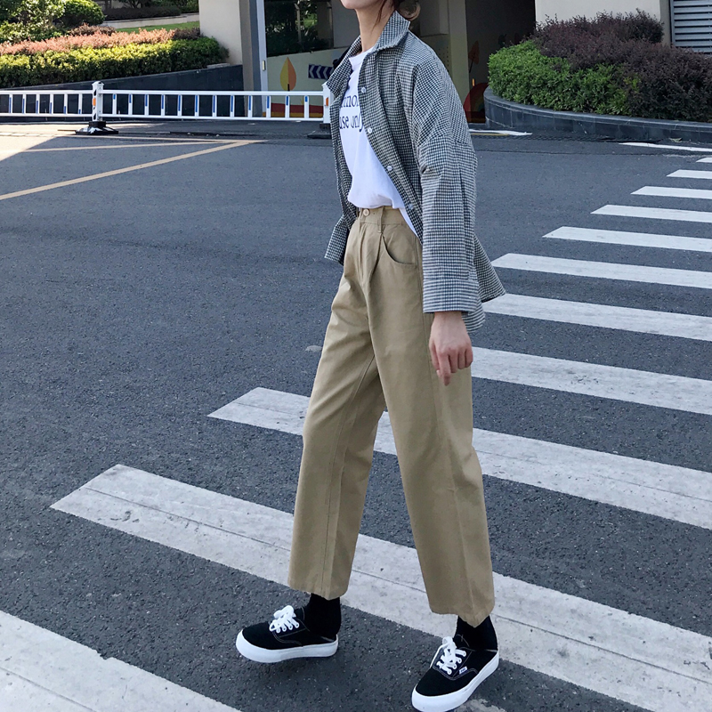 / 秋季女裝韓版寬松顯瘦高腰工裝休閑褲半松緊腰闊腿褲九分褲直筒褲