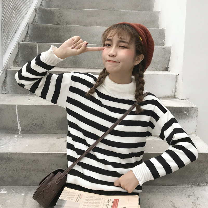 / 秋冬女裝2018新款韓版百搭套頭長袖針織衫學生寬松條紋毛衣外套潮