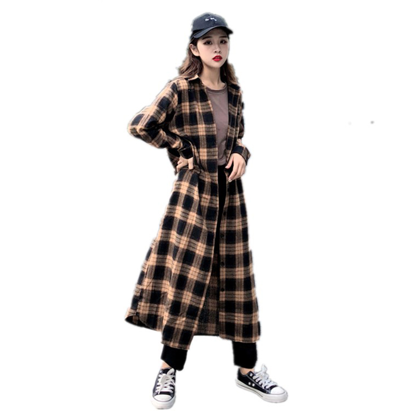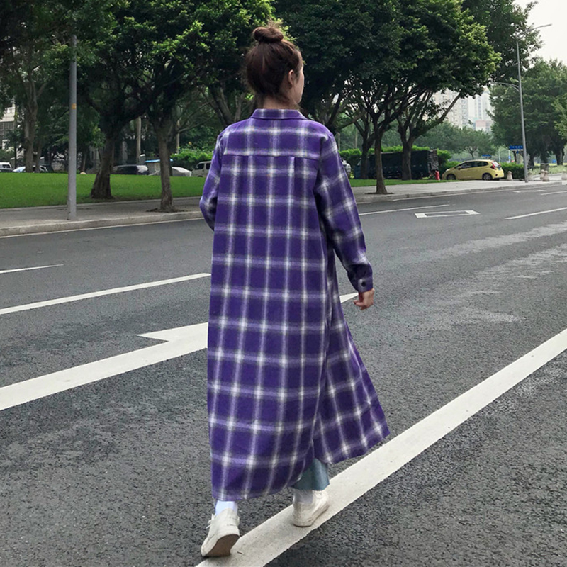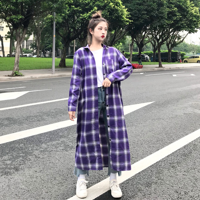 / 秋季女裝韓版港味休閑寬松顯瘦百搭中長款學生長袖格子襯衫外套潮