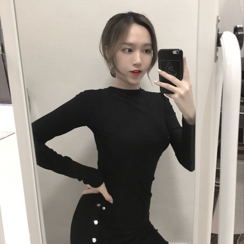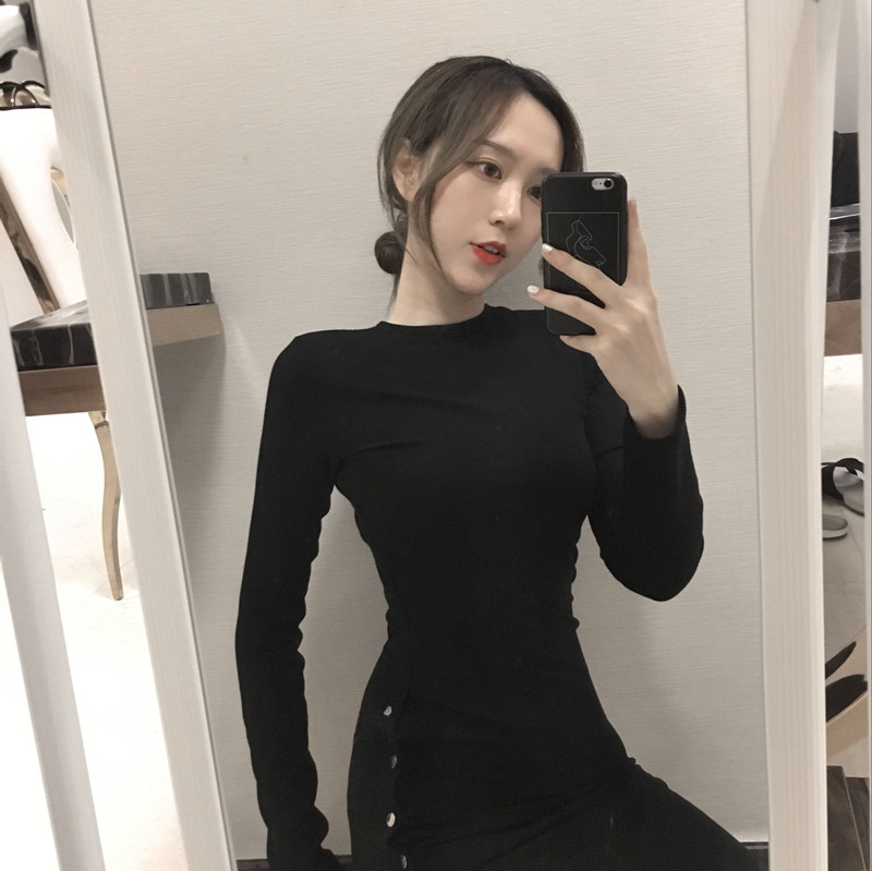 / 港味新品韓版秋裝連衣裙女chic圓領長袖彈力緊身顯瘦排扣中長裙潮