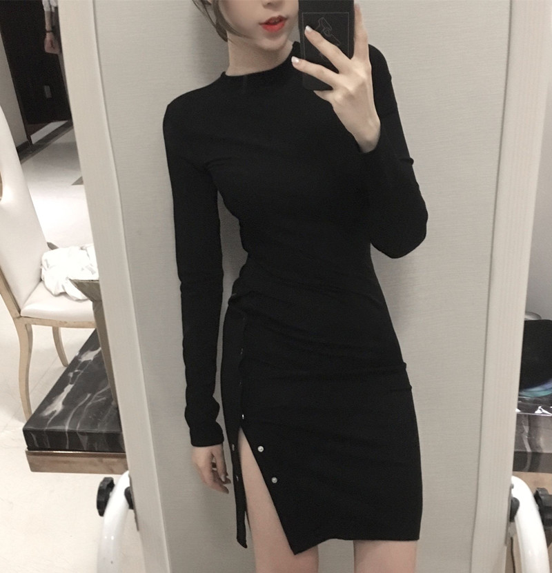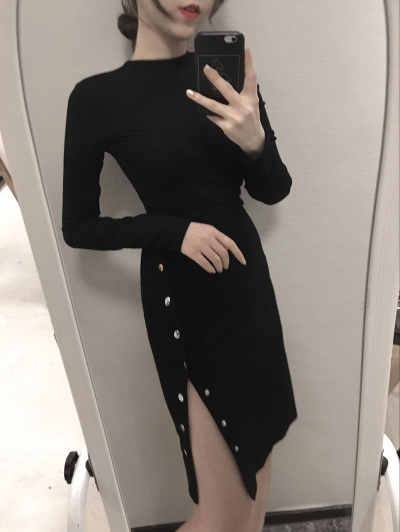 港味新品韓版秋裝連衣裙女chic圓領長袖彈力緊身顯瘦排扣中長裙潮