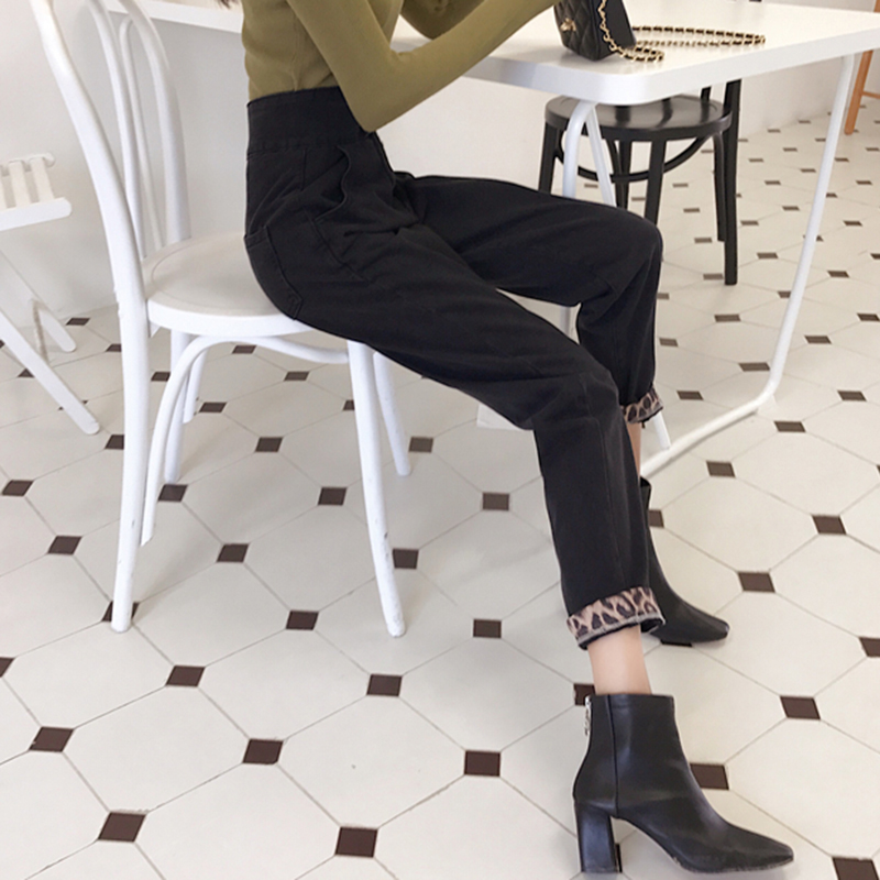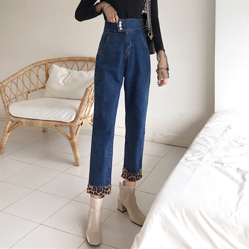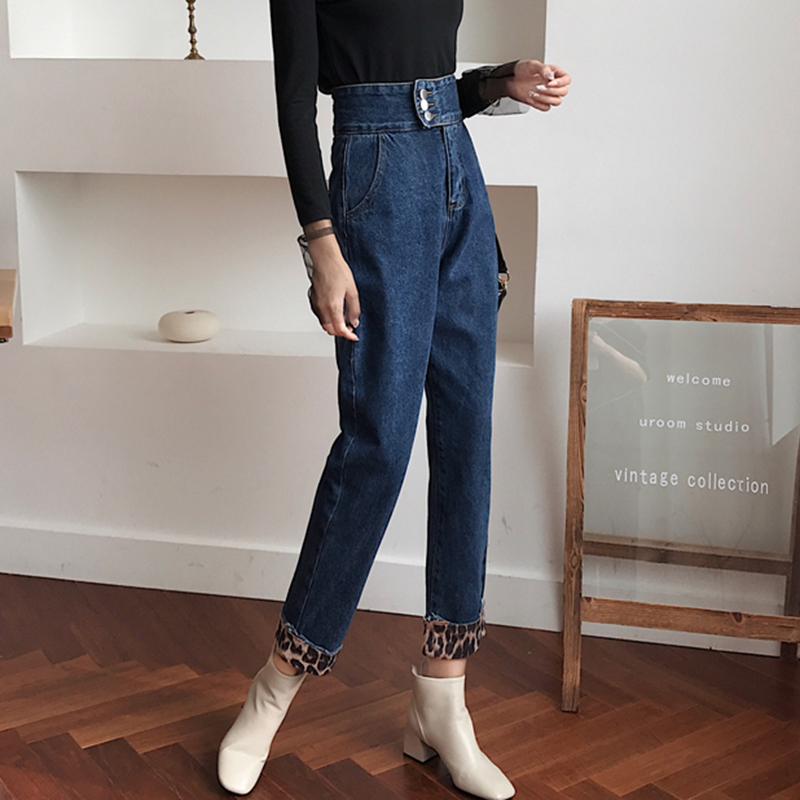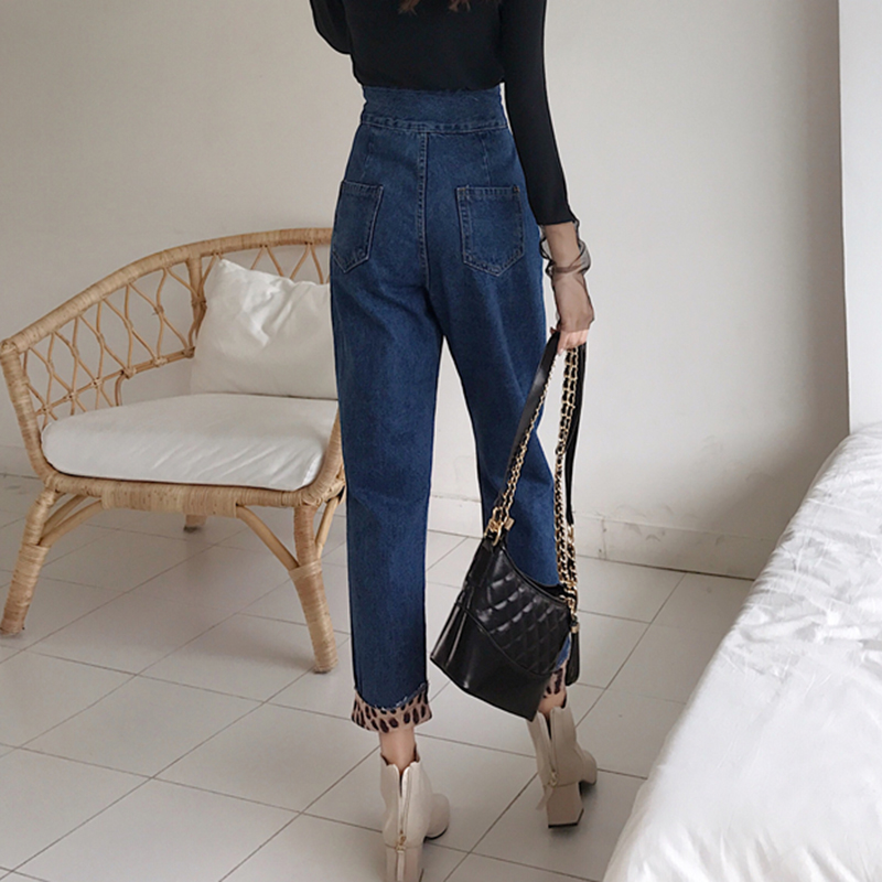 / 高腰顯瘦豹紋拼接哈倫牛仔長褲女秋冬裝新款復古寬松休閑老爹褲子