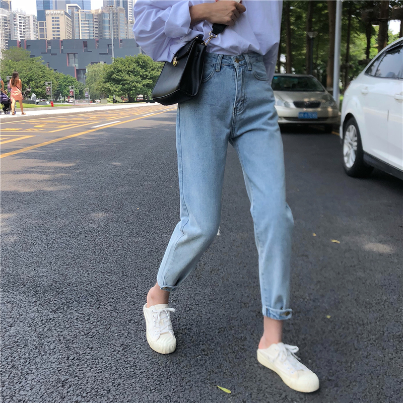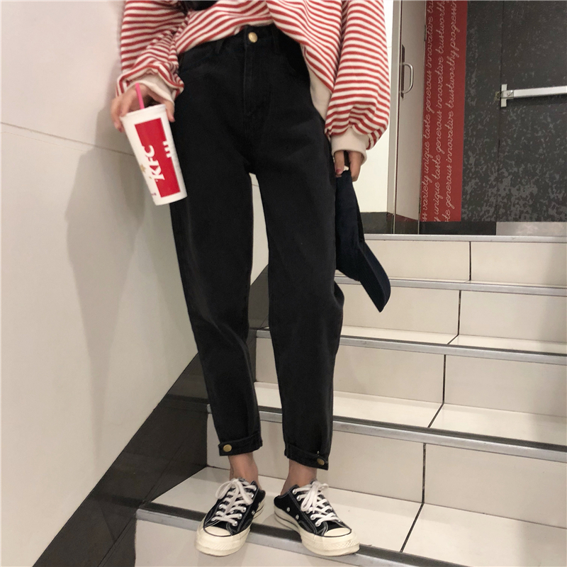 / 秋季女裝韓版褲腳紐扣收口九分褲牛仔褲寬松高腰顯瘦束腳褲直筒褲