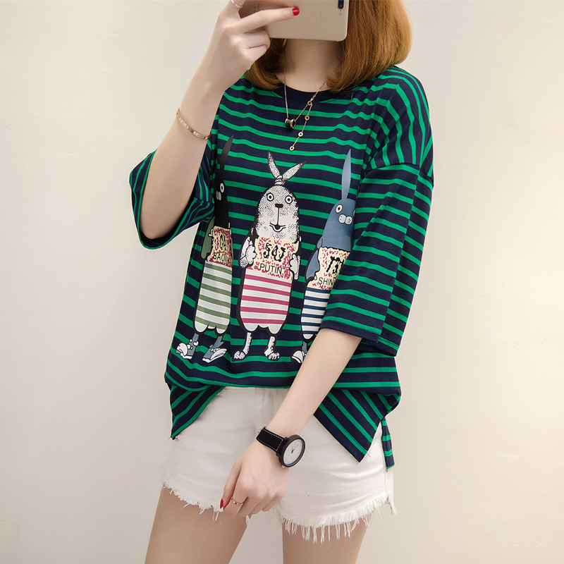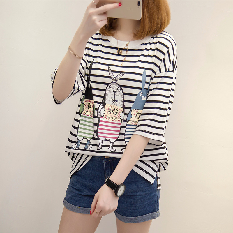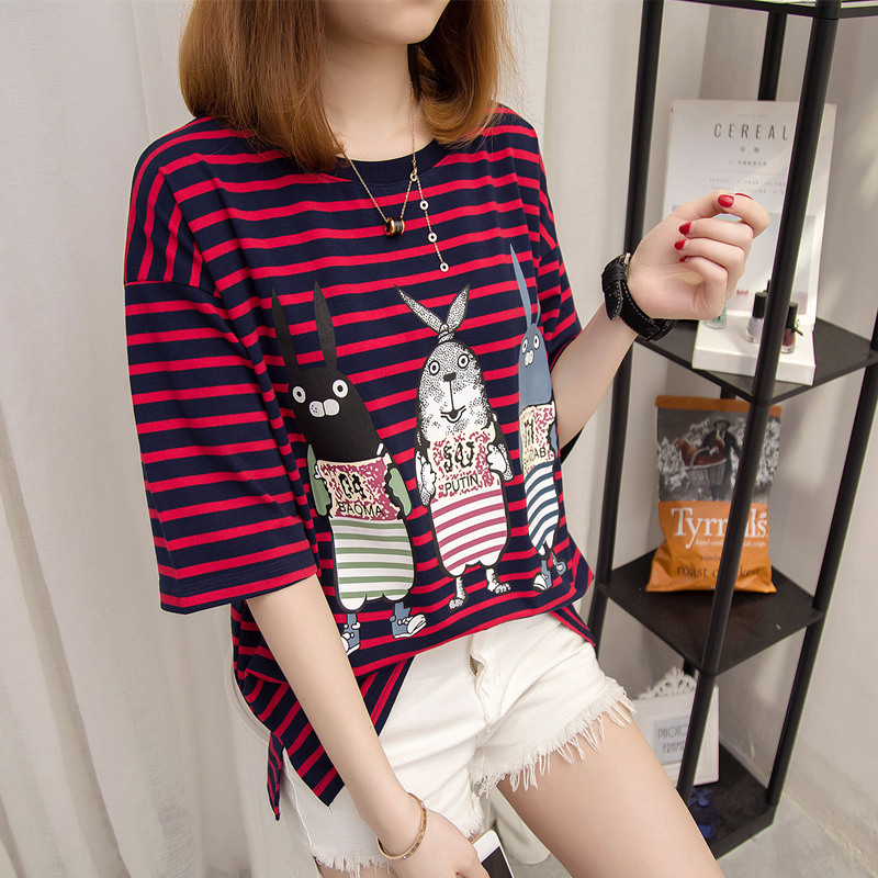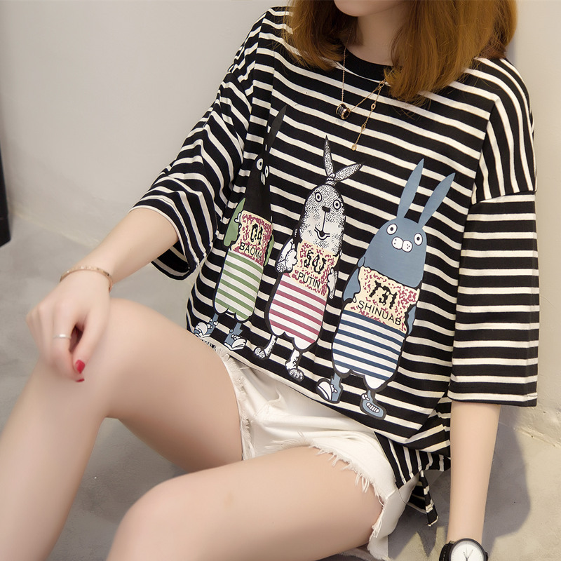 夏季短袖女上衣學生韓國寬松bf風條紋t恤女小清新新款潮衣服
