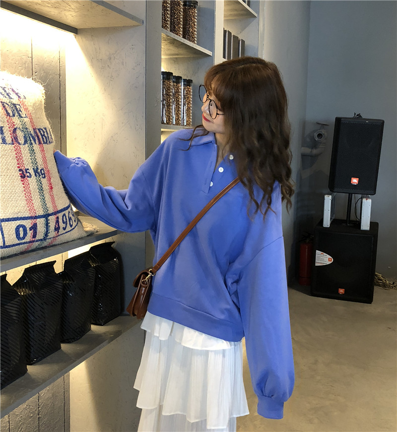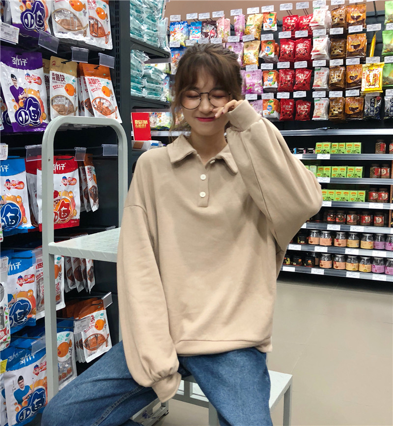 / 秋季女裝韓版學院風寬松純色Polo領燈籠袖長袖套頭衛衣上衣外套潮