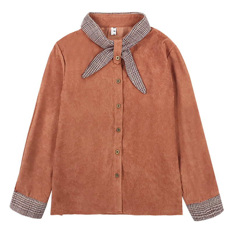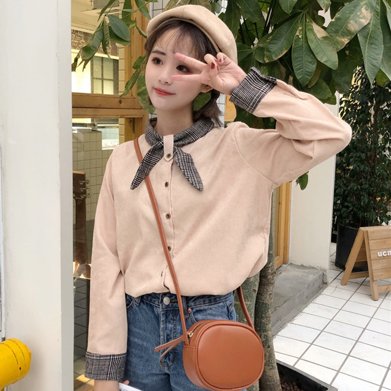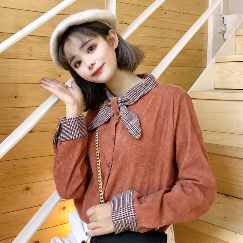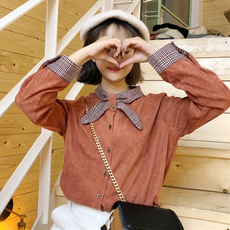 / 學院風襯衫秋裝女2018新款撞色蝴蝶結襯衣學生寬松燈芯絨長袖上衣