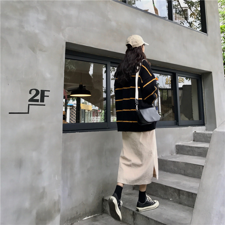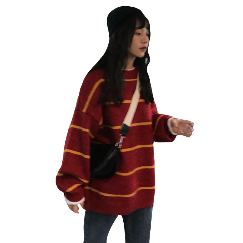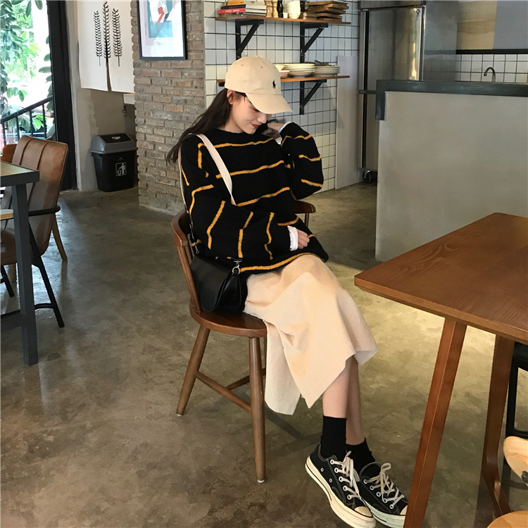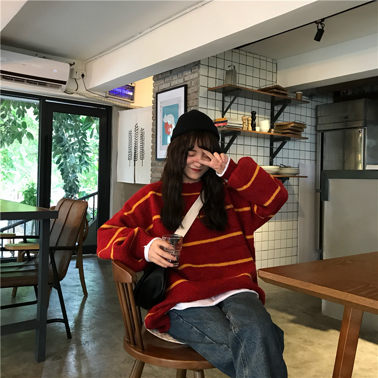 / 秋冬韓版中長款BF風寬松條紋慵懶風軟妹毛衣網紅套頭可愛針織衫女