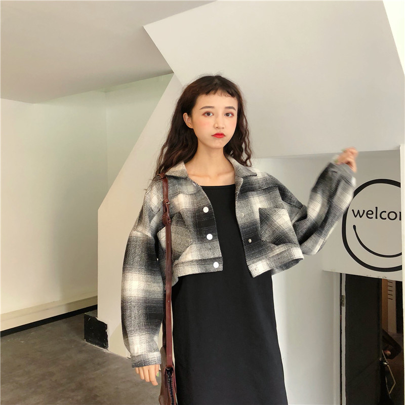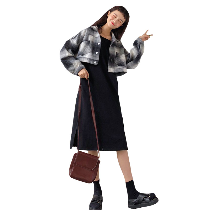 韓版時尚休閑套裝秋季女裝短款格子呢子外套+吊帶裙連衣裙兩件套