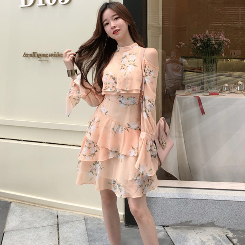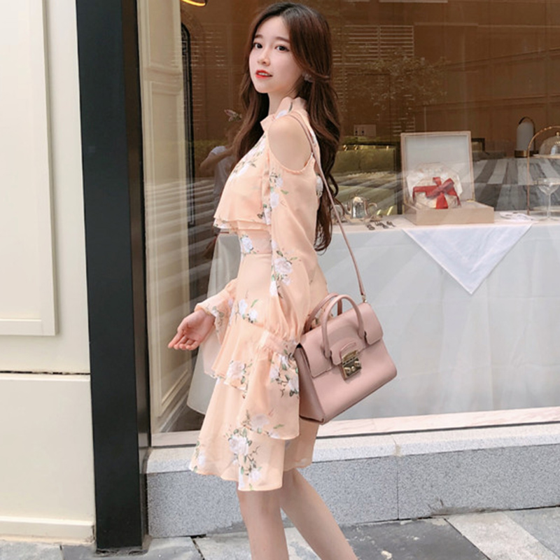 / 女秋裝2018新款 超仙連衣裙 初戀碎花裙復古長袖露肩荷葉連衣裙子
