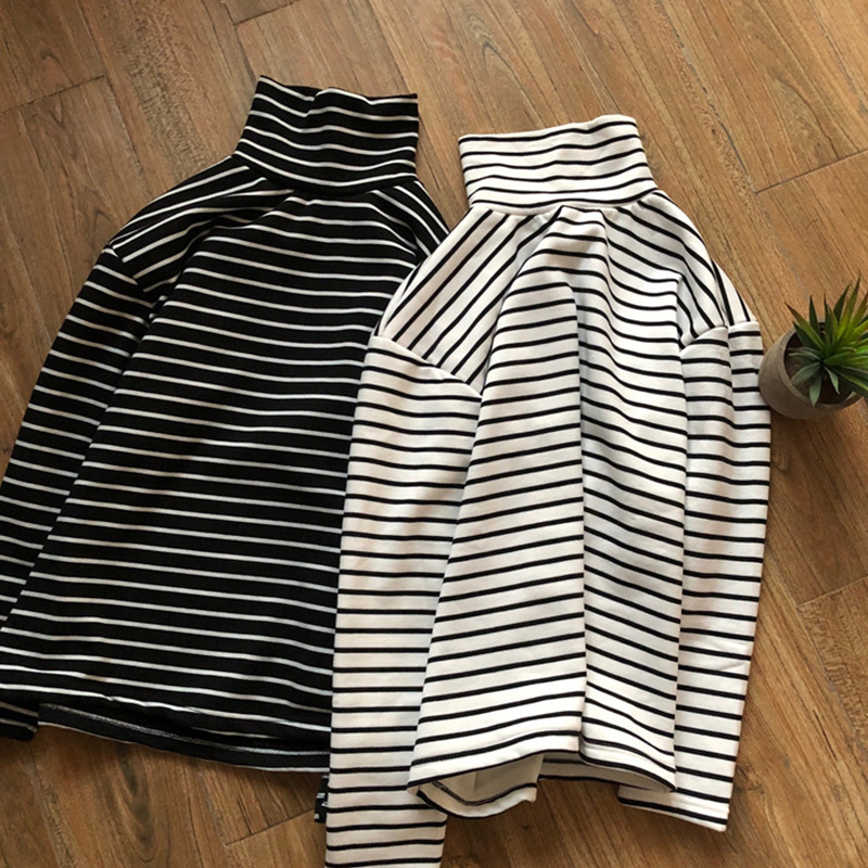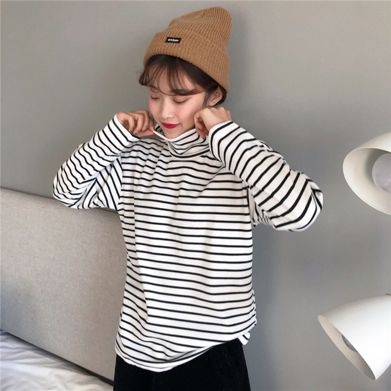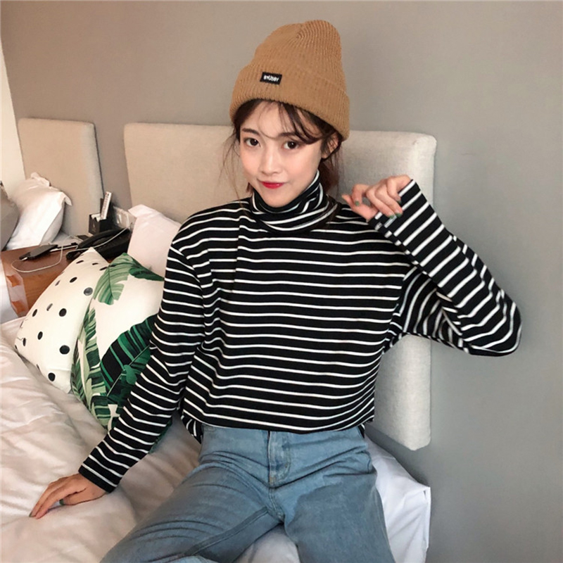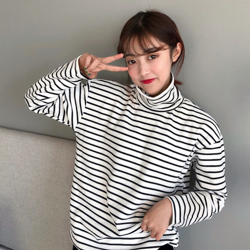 chic高領條紋打底衫女秋冬裝2018新款韓版百搭加絨內搭長袖T恤潮