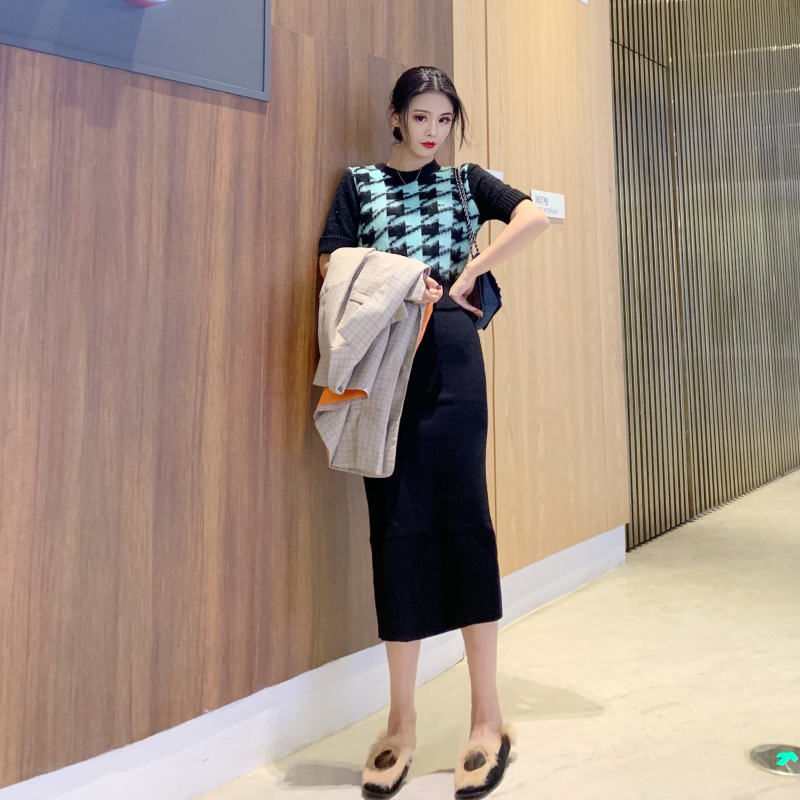 / 韓版修身高領打底衫女+馬海毛千鳥格毛衣女+半身包臀裙針織裙套裝