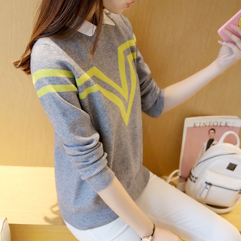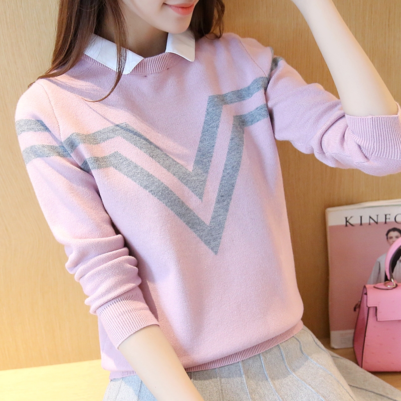 秋季女裝套裝潮假兩件上衣條紋針織衫女套頭毛衣秋冬新款百搭打底