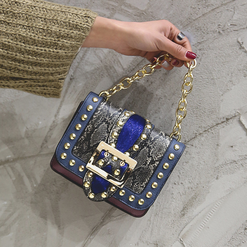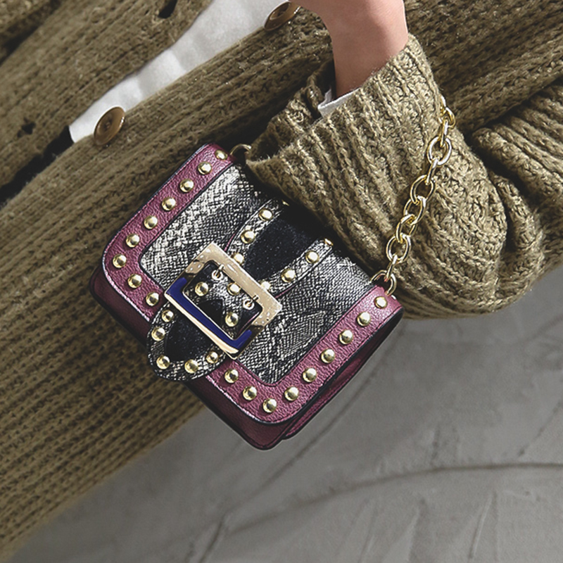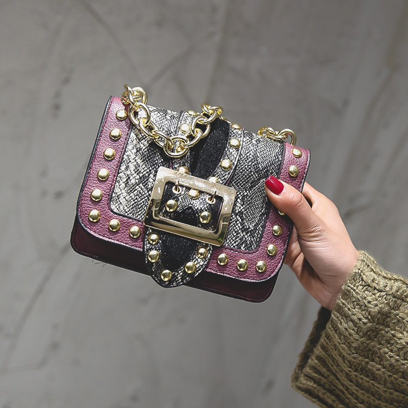 / 新款蛇皮紋鏈條斜挎包女包日韓版時尚迷你鉚釘單肩包包小包潮