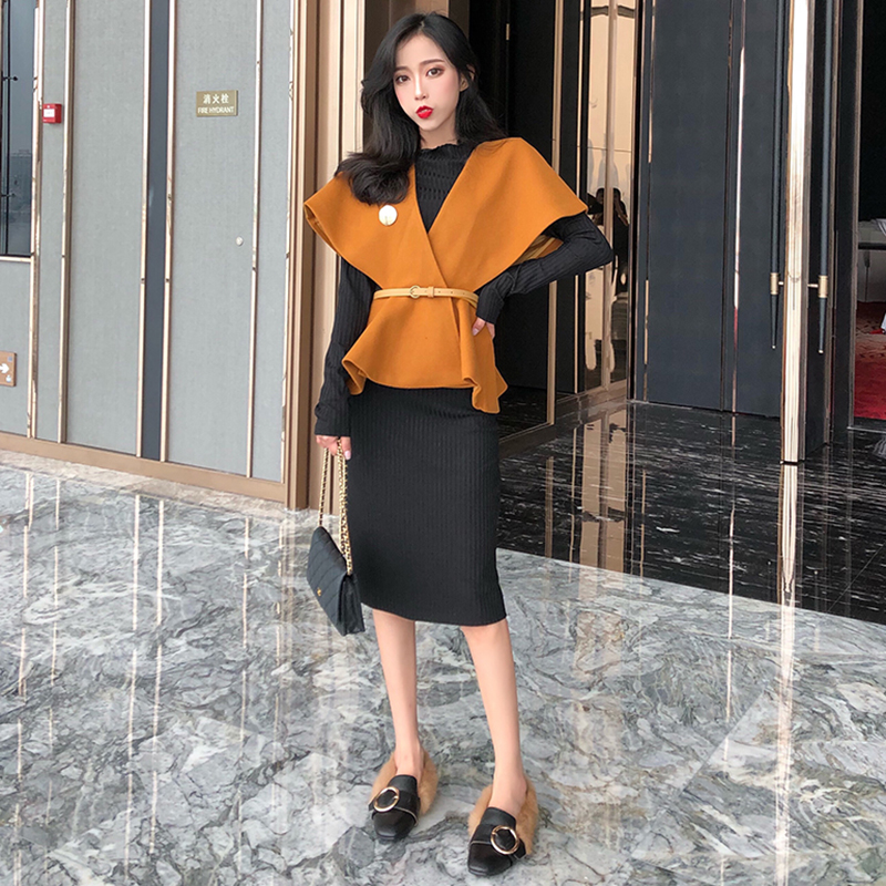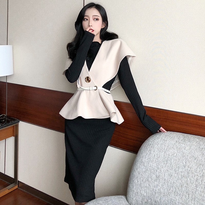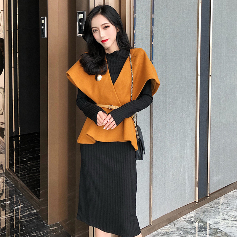 / 洋氣套裝秋冬女2018新款韓版收腰呢子斗篷馬甲修身長袖打底連衣裙