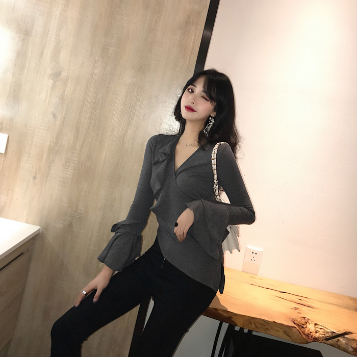 / 韓版復古V領荷葉邊不規則修身喇叭袖打底上衣秋冬長袖內搭T恤女潮