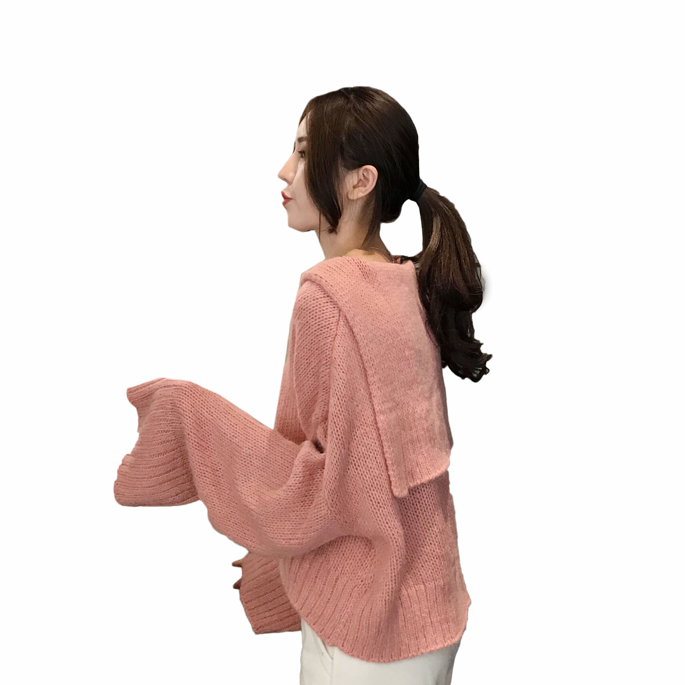 韓版chic早秋慵懶溫柔毛衣坑條V領一排扣喇叭袖純色百搭針織開衫