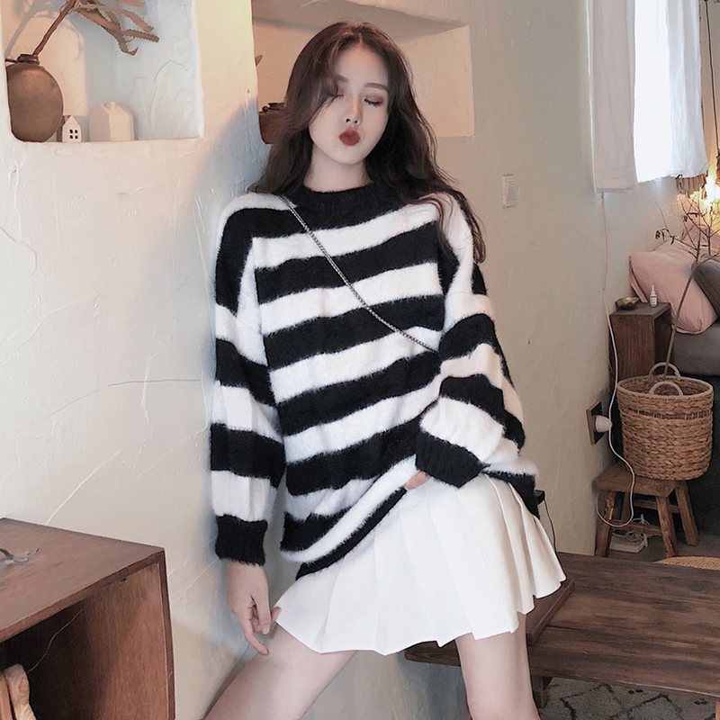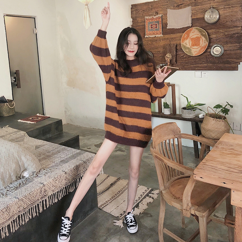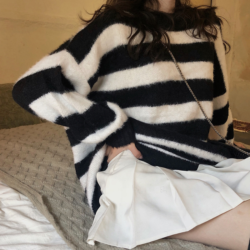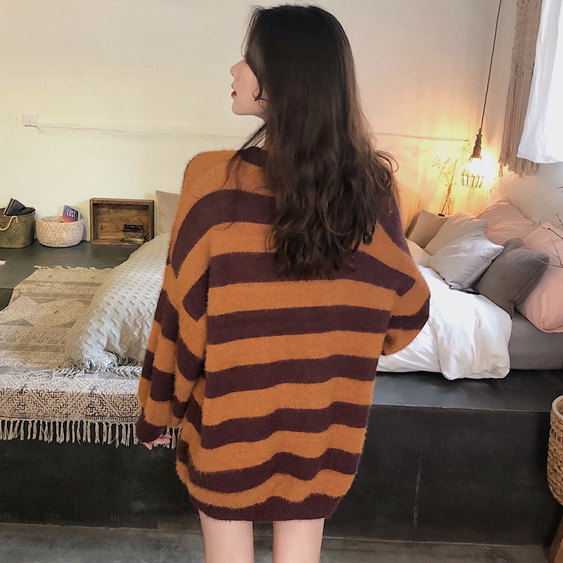慵懶風毛衣外套女chic秋冬裝2018新款韓版寬松條紋撞色長袖針織衫