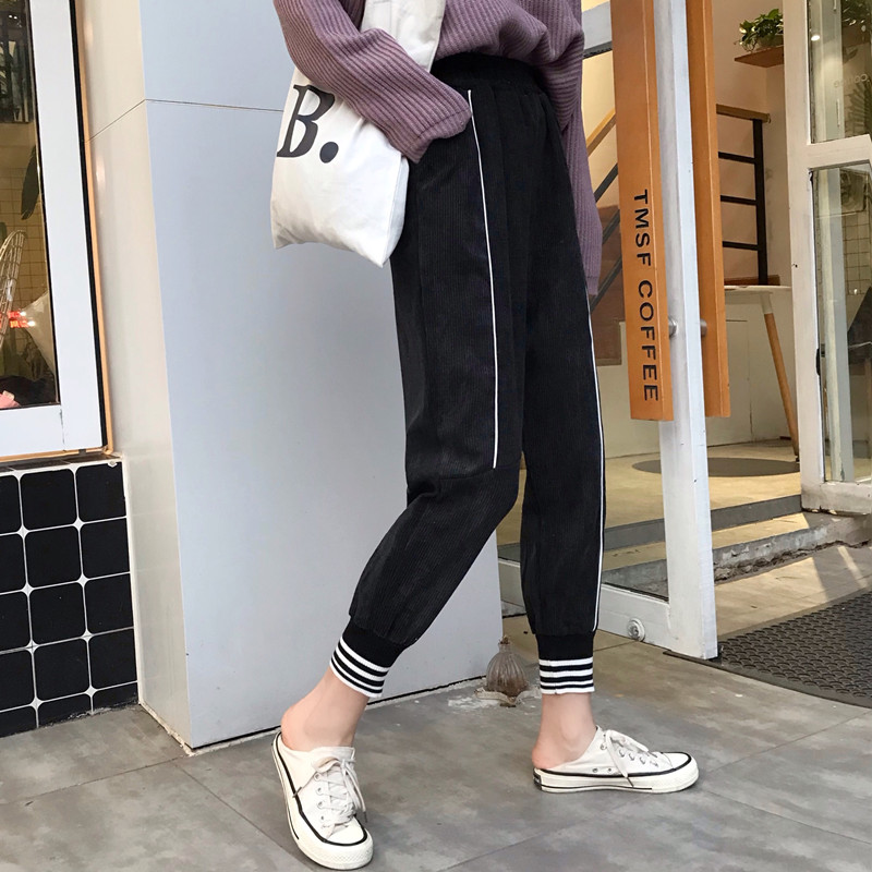 / 長褲子女秋冬裝新款韓版寬松條紋燈芯絨學生哈倫褲高腰休閑小腳褲
