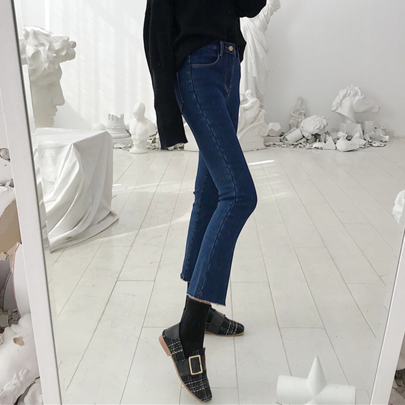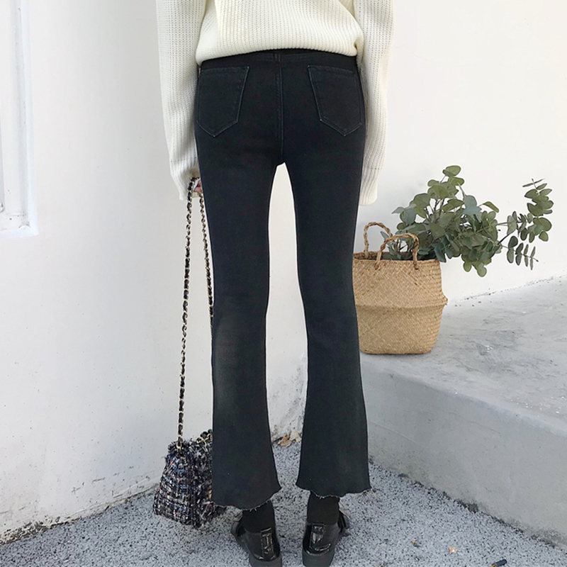 / 高腰顯瘦毛邊喇叭牛仔褲女秋冬裝新款復古風加絨黑色休閑八分褲子