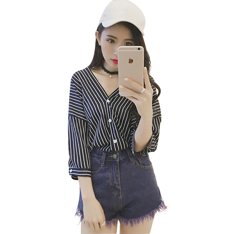 秋裝2018新款夏韓范時尚寬松顯瘦學生豎條紋V領襯衫女蝙蝠袖上衣
