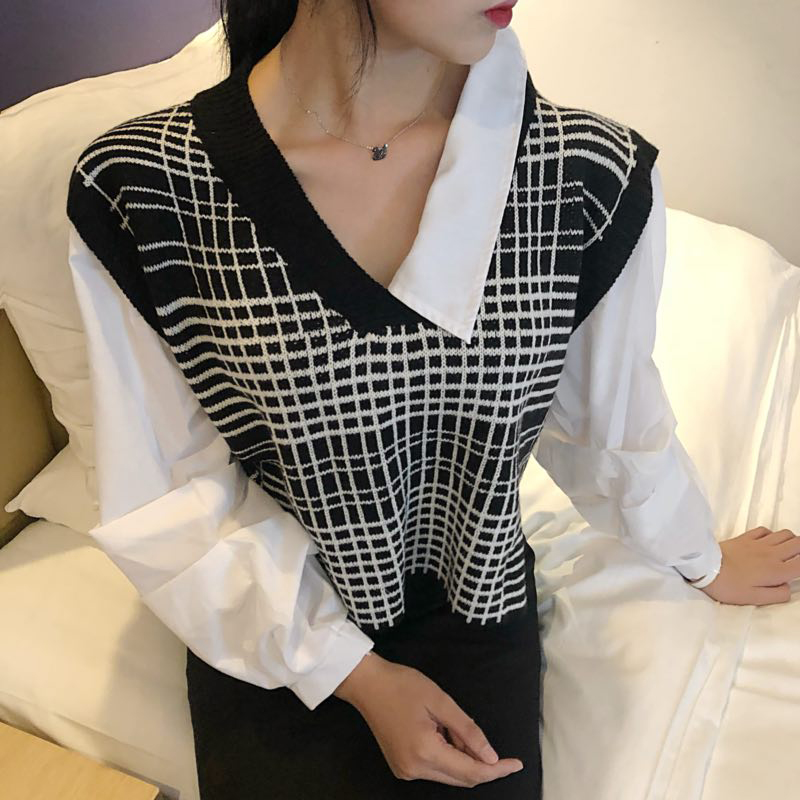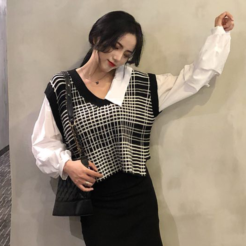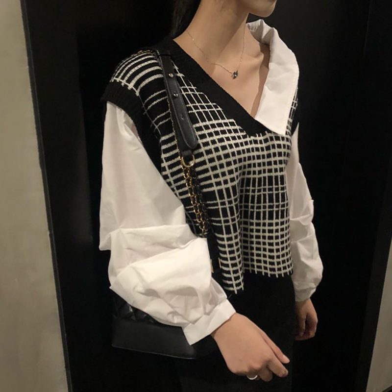 / 假兩件拼接格子襯衣女秋冬裝2018新款韓版寬松V領燈籠長袖襯衫潮