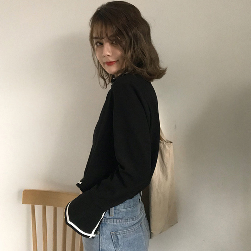 / 秋季女裝韓版條紋拼接開叉喇叭袖氣質襯衫學生長袖休閑襯衣上衣潮