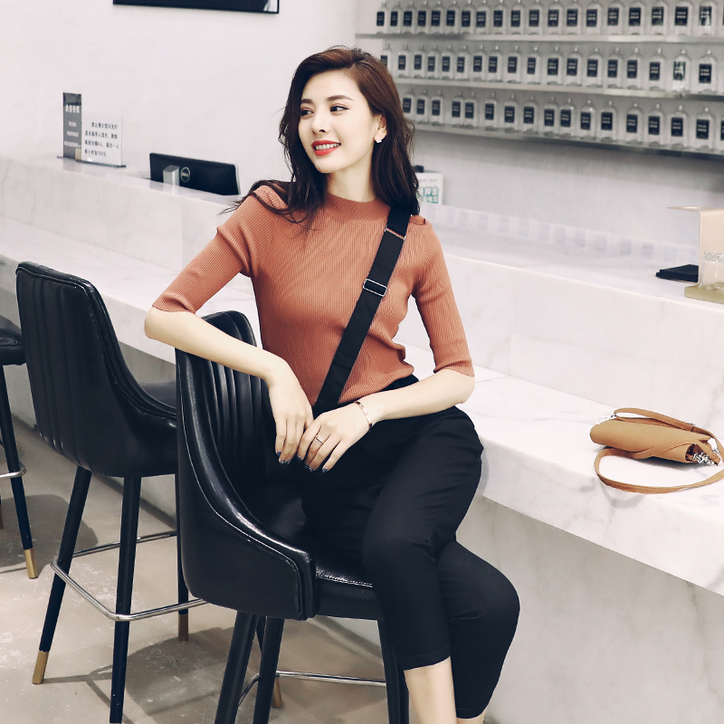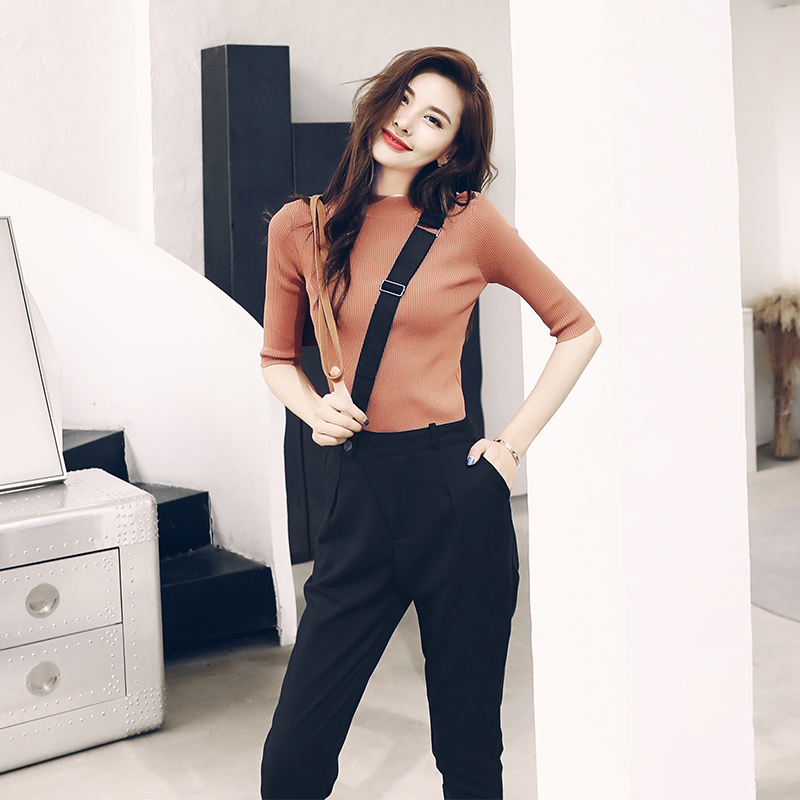 / 2018夏季新款修身顯瘦氣質針織衫毛衣七分小腳褲背帶褲秋季套裝潮