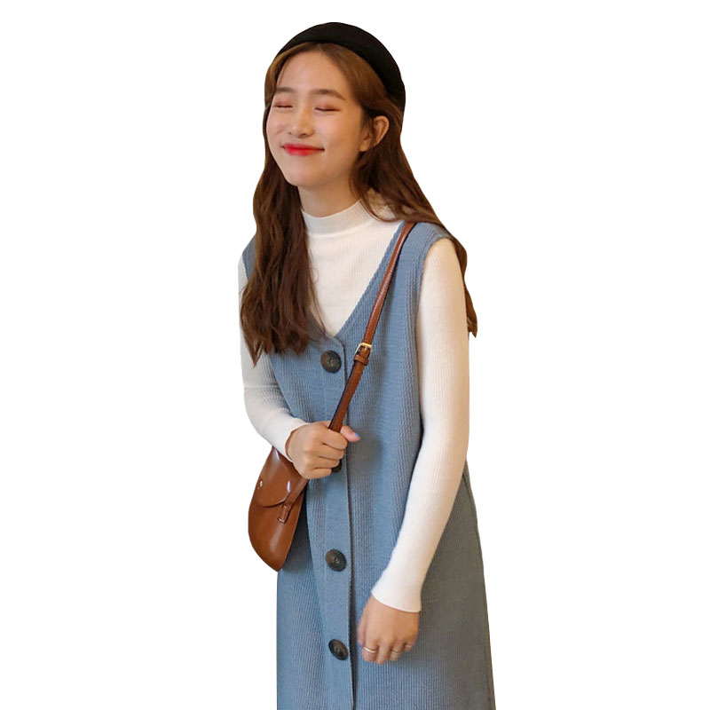秋季女裝韓版時尚休閑套裝V領針織背心裙連衣裙+打底針織衫兩件套