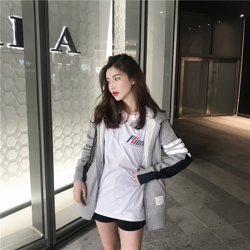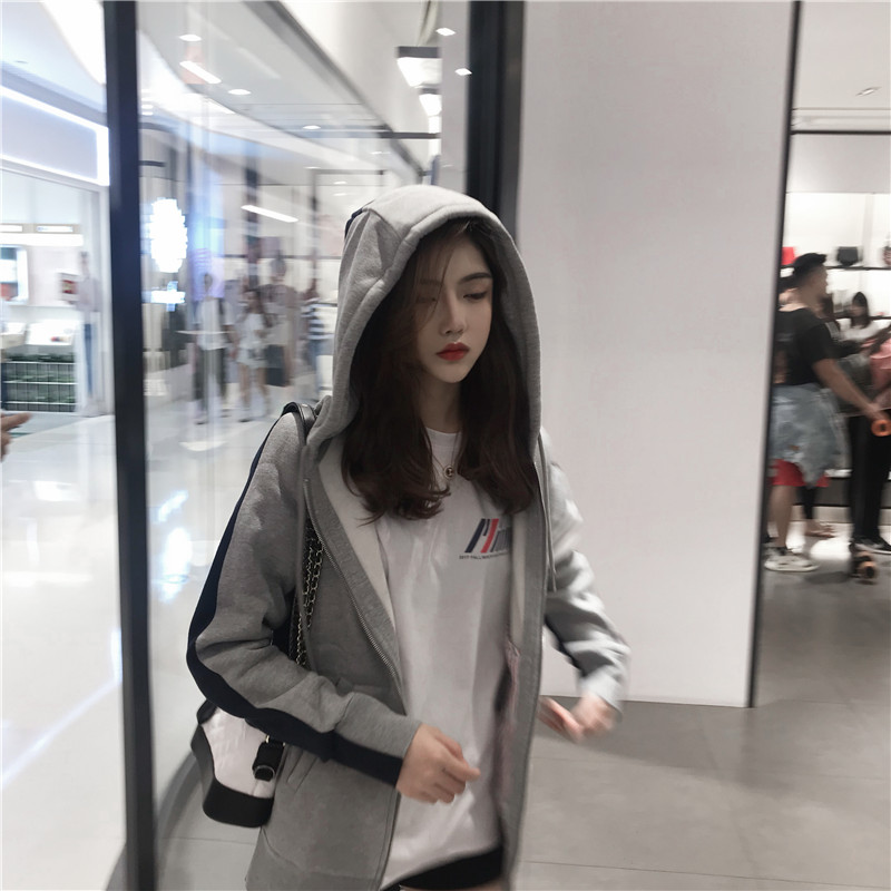 chic復古秋冬上衣慵懶衛衣女秋寬松拼色連帽休閑加絨拉鏈外套女潮
