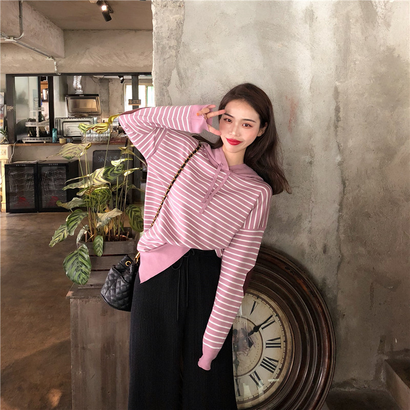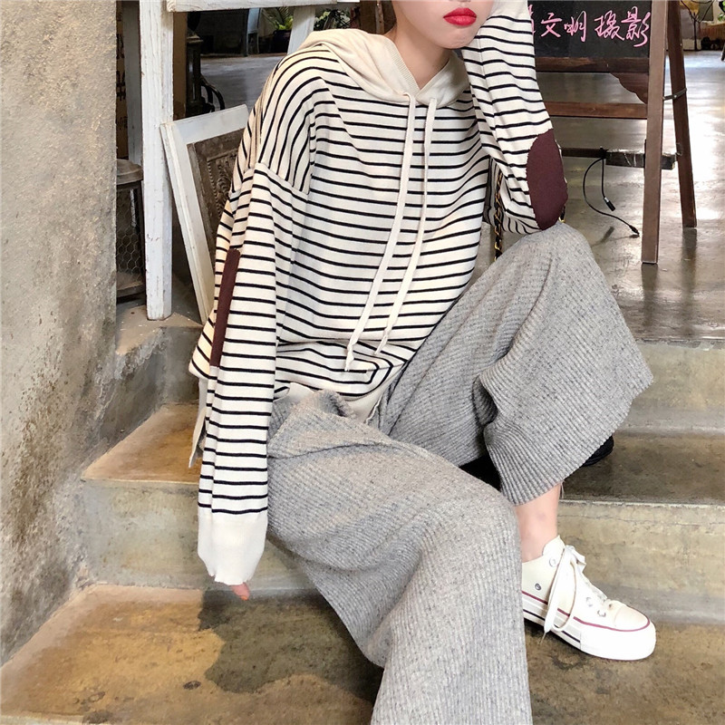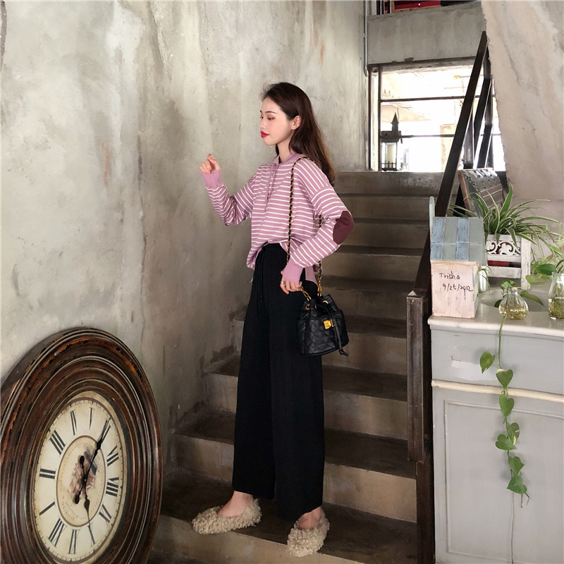 秋裝女2018新款軟糯連帽條紋毛衣女+慵懶風舒適闊腿褲(加厚版)