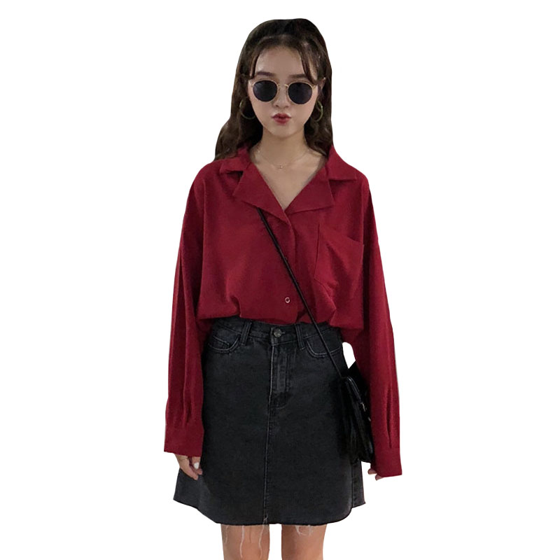 / 秋季女裝韓版復古氣質純色長袖襯衫翻領寬松休閑襯衣chic風上衣潮
