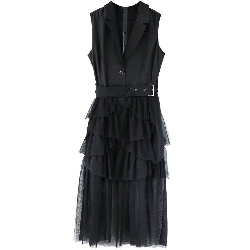 / s秀名媛氣質2018新品職業OL無袖中長款蕾絲網紗拼接馬甲連衣裙潮