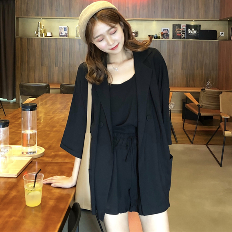 / 早秋新款套裝韓版女裝小吊帶+西裝外套+高腰短褲純色洋氣三件套潮