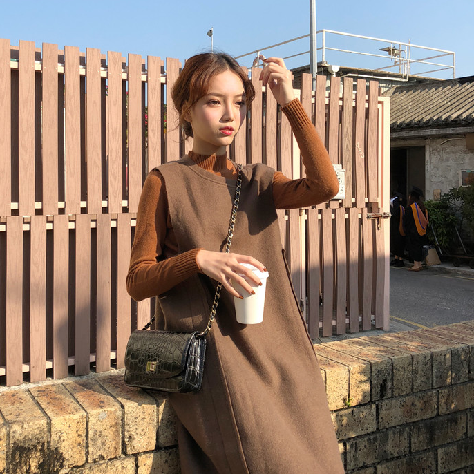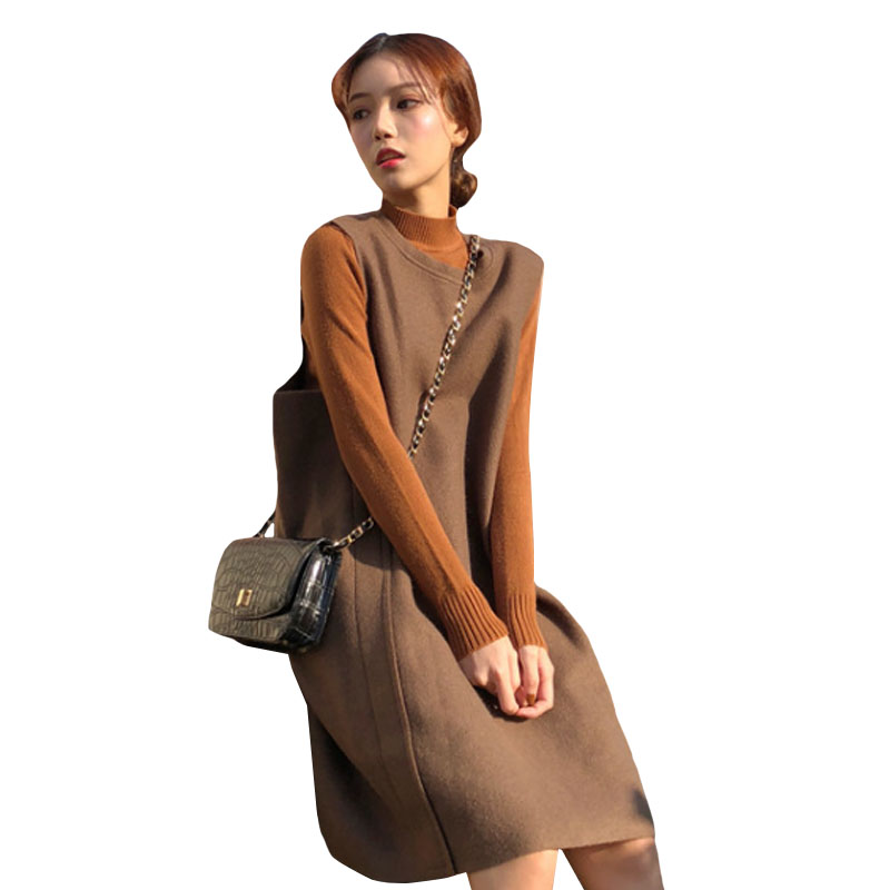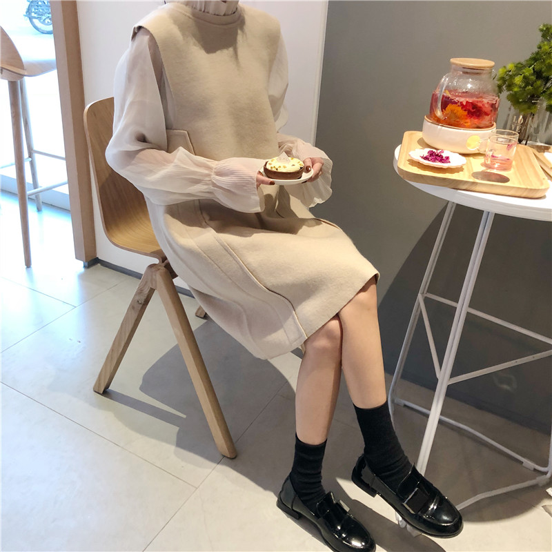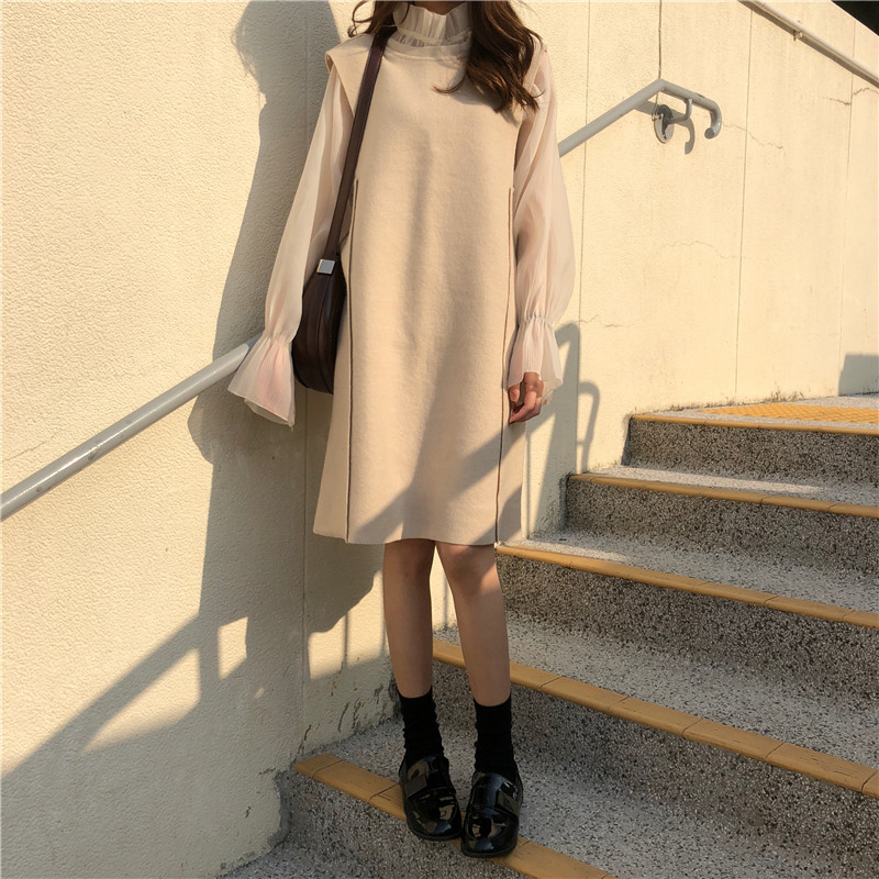 / 秋季韓版中長款寬松背后系帶無袖呢料背心裙連衣裙學生顯瘦裙子女