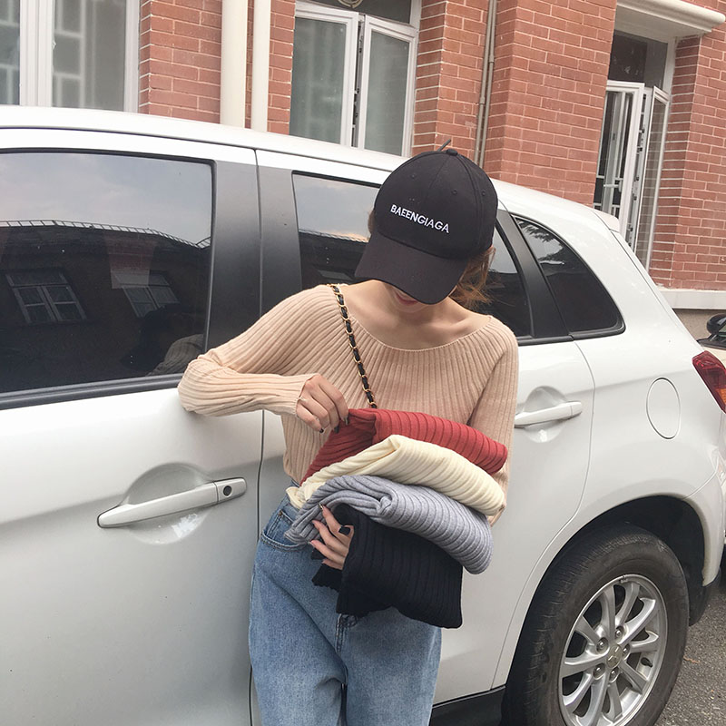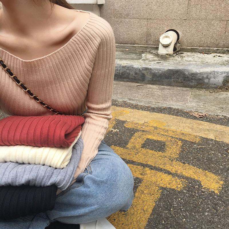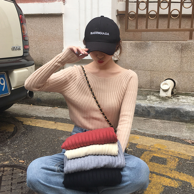 / 秋冬韓版修身顯瘦純色一字領針織衫學生網紅套頭打底衫毛衣上衣女