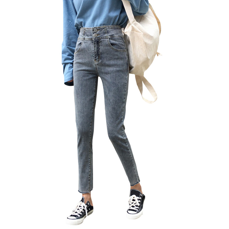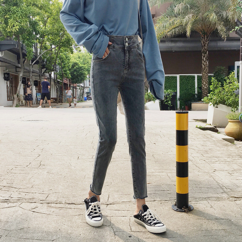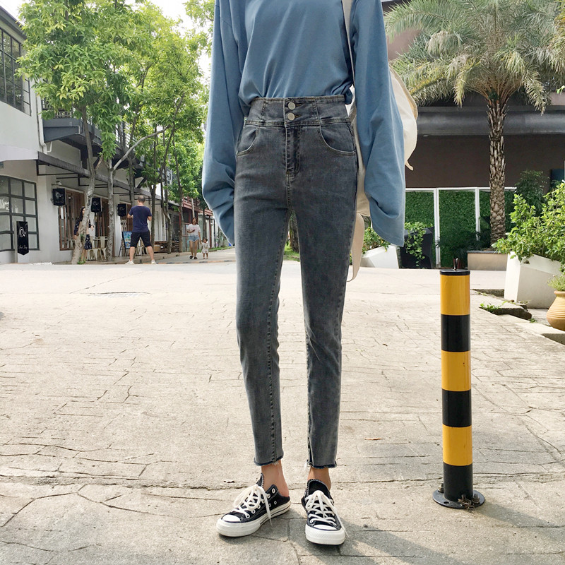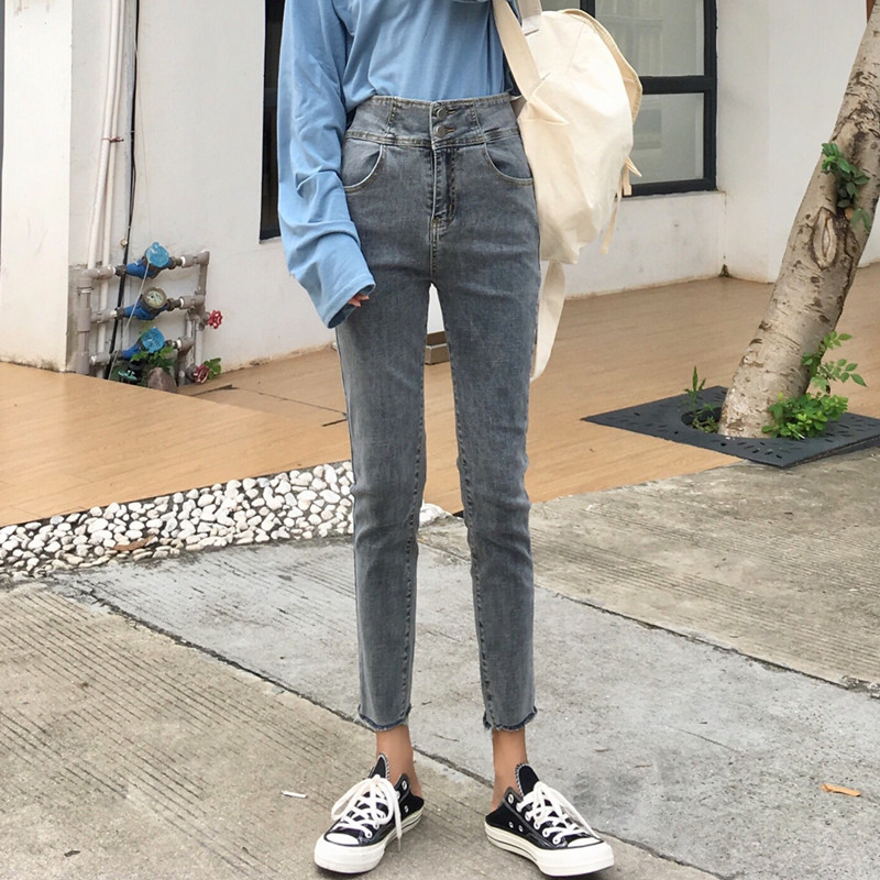 / 秋季韓版復古做舊高腰兩粒扣牛仔褲修身顯瘦鉛筆褲小腳褲九分褲女