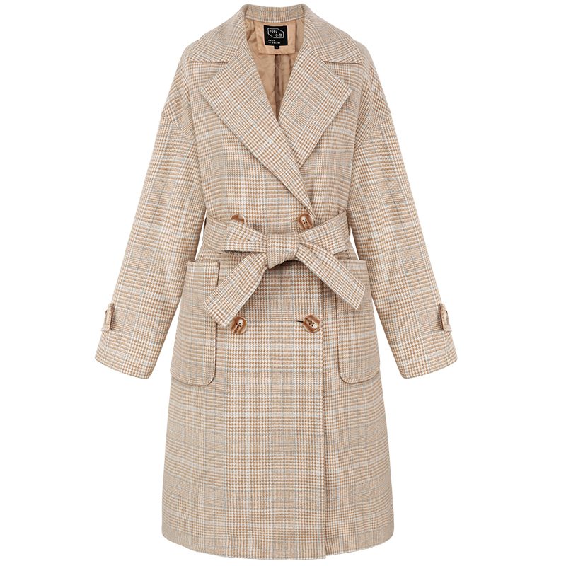 MG小象復古格子毛呢外套女中長款2018新款蝴蝶結收腰冬季呢子大衣