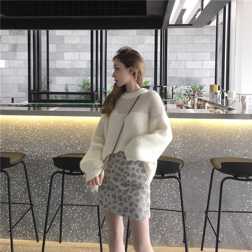 / 新款拼接燈籠袖毛衣毛呢豹紋半身裙A字裙子兩件套港風時尚套裝女