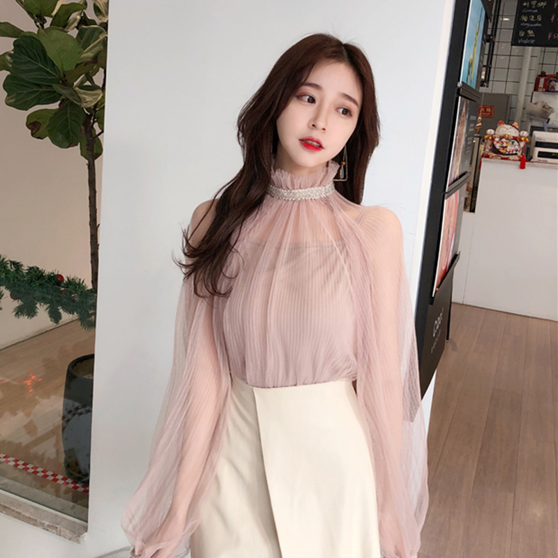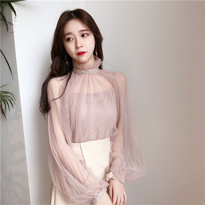 / 早春新款女裝氣質宮廷袖透視網紗釘珠罩衫+內搭小吊帶學生兩件套