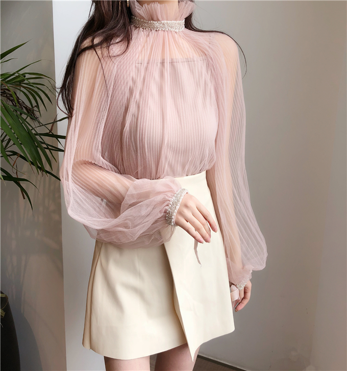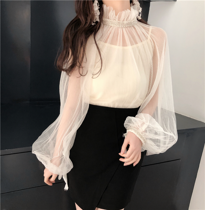 早春新款女裝氣質宮廷袖透視網紗釘珠罩衫+內搭小吊帶學生兩件套