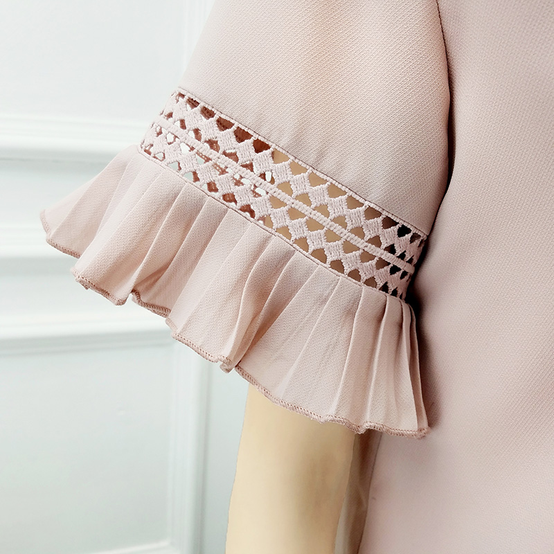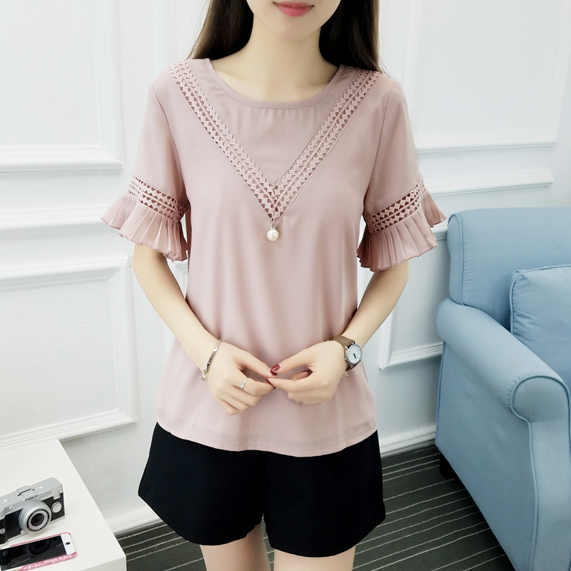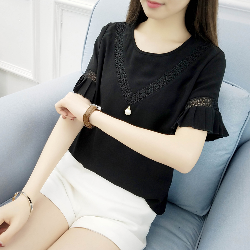 雪紡衫女短袖夏裝新款韓版喇叭袖甜美蕾絲寬松荷葉邊雪紡上衣