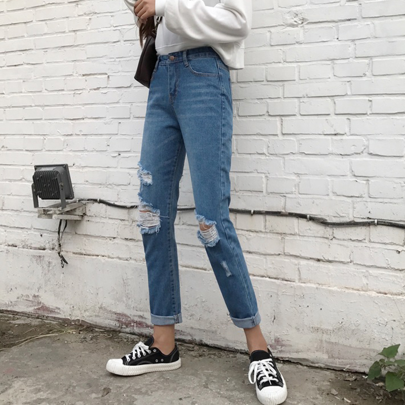 怪味少女褲秋冬裝2018新款韓版個性磨破洞直筒褲高腰顯瘦牛仔長褲