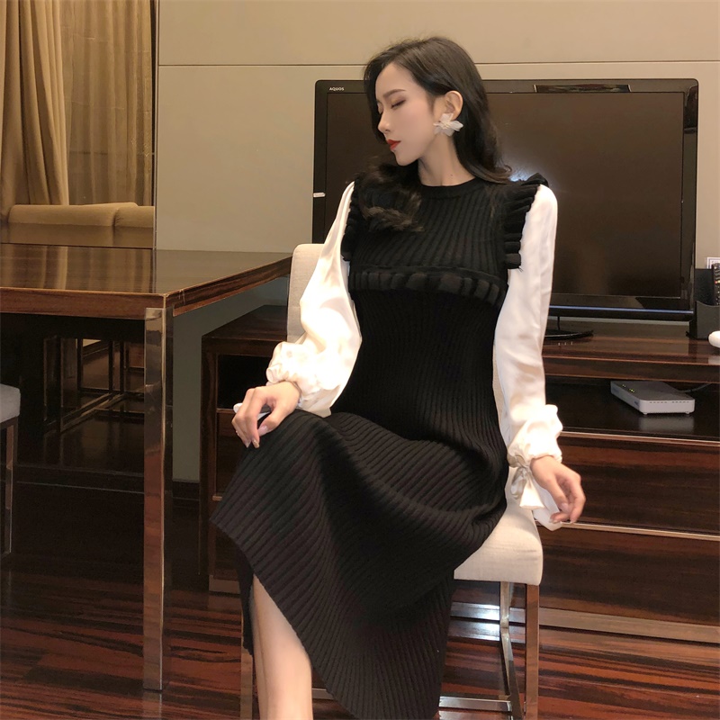 新款初秋溫柔風時尚氣質拼接假兩件針織連衣裙復古長袖百搭長裙女