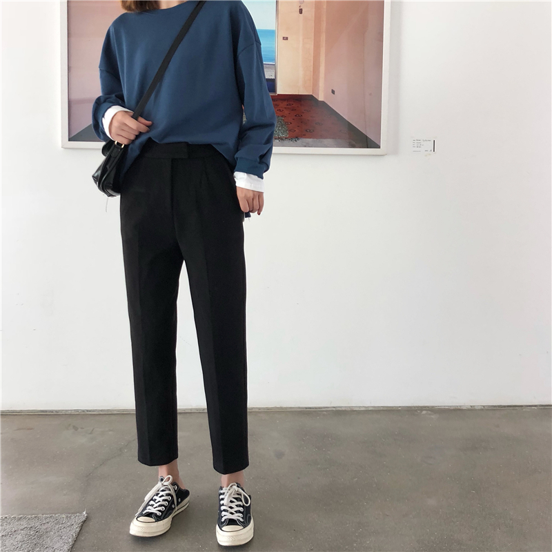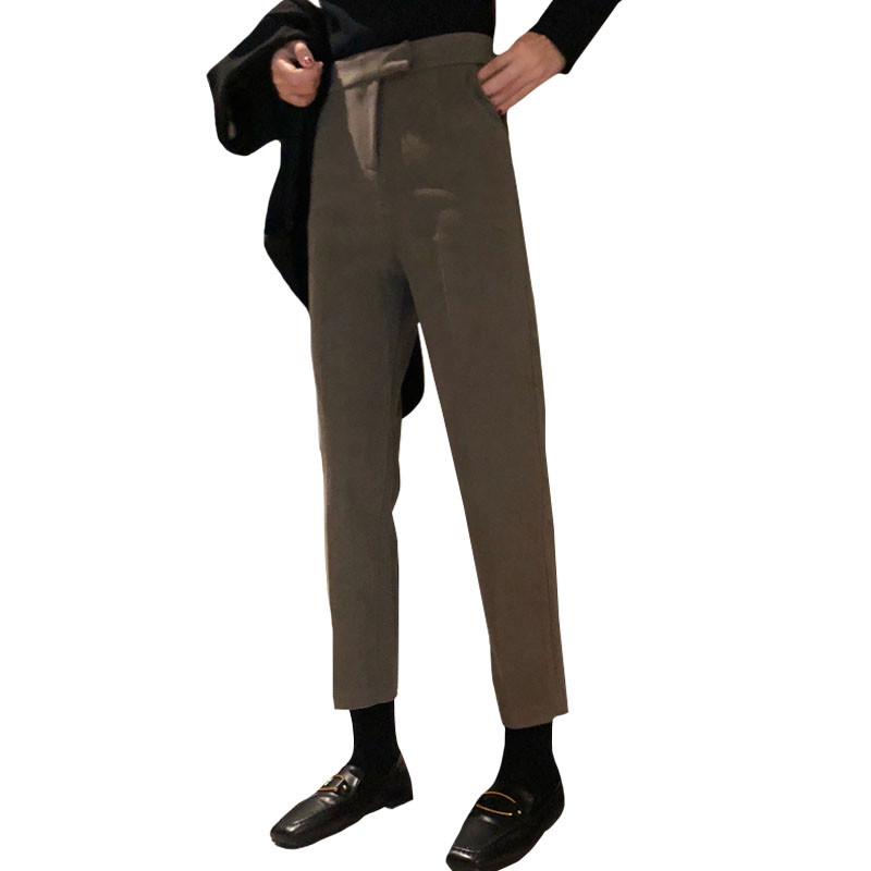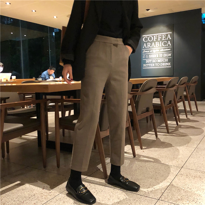 / 秋冬韓版寬松加厚毛呢抽褶九分褲西裝褲高腰直筒褲休閑褲闊腿褲女