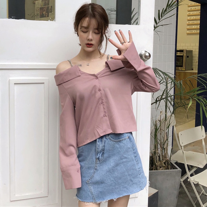 / 秋裝女新款時尚氣質心機一字露肩襯衫黑色鏈條吊帶開叉長袖上衣潮