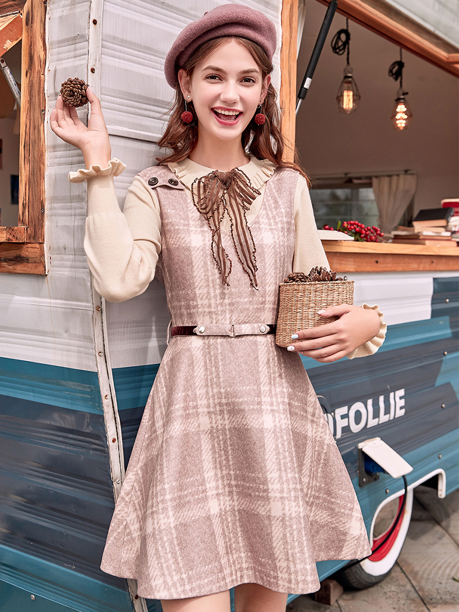 MG小象復古格紋連衣裙女秋冬2018新款V領無袖腰帶學生少女心裙子