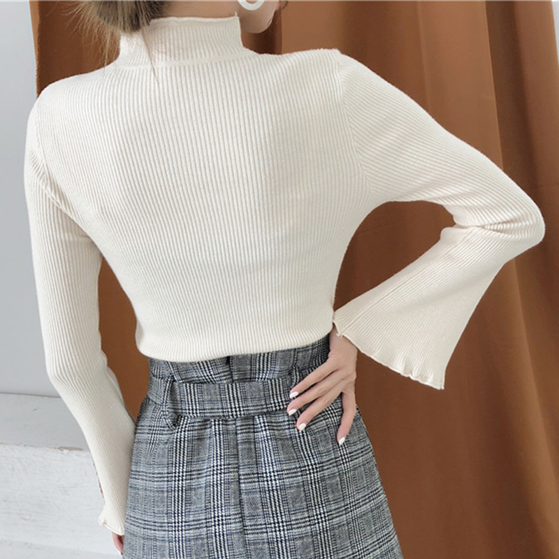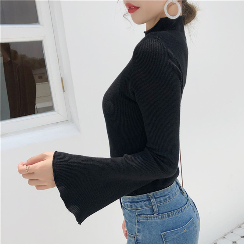 早秋2018新款女裝復古氣質半高領針織上衣修身顯瘦喇叭長袖打底衫